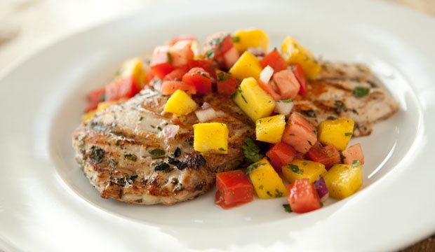 Once the fish comes off the grill, spoon the mango salsa evenly over the top. Then sprinkle with the remaining 2 tablespoons of cilantro to finish.