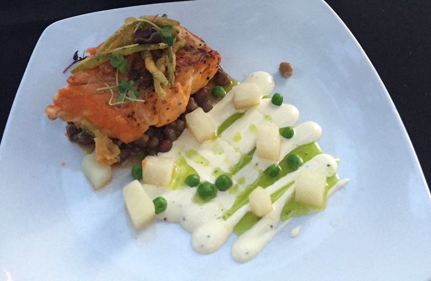 For plating, place the crowder peas on the plate, then put the fish on the top. Place the turnips and sweet peas on the plate. Drizzle lemon aioli over the dish, then some basil oil. Spoon over the tomato puree from the pan on the fish, garnish with tomato and jalapeño.