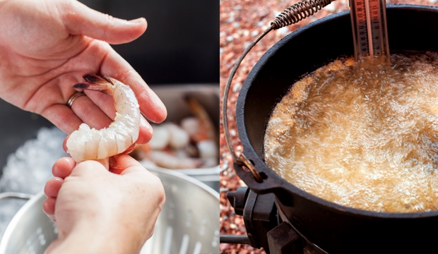 Note: If you’ll be cooking the Kowaliga Hushpuppies at the same outing, we heartily recommend doing the hushpuppies first. Not only are hushpuppies pretty forgiving, but shrimp are always best right out of the fryer and will cool much quicker than the pups.